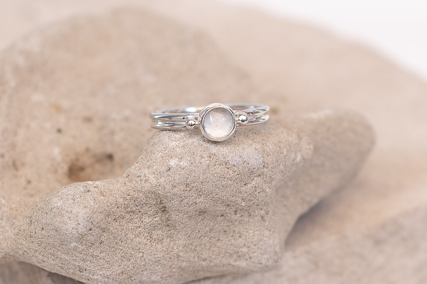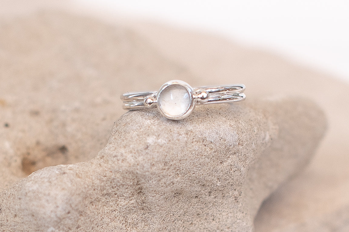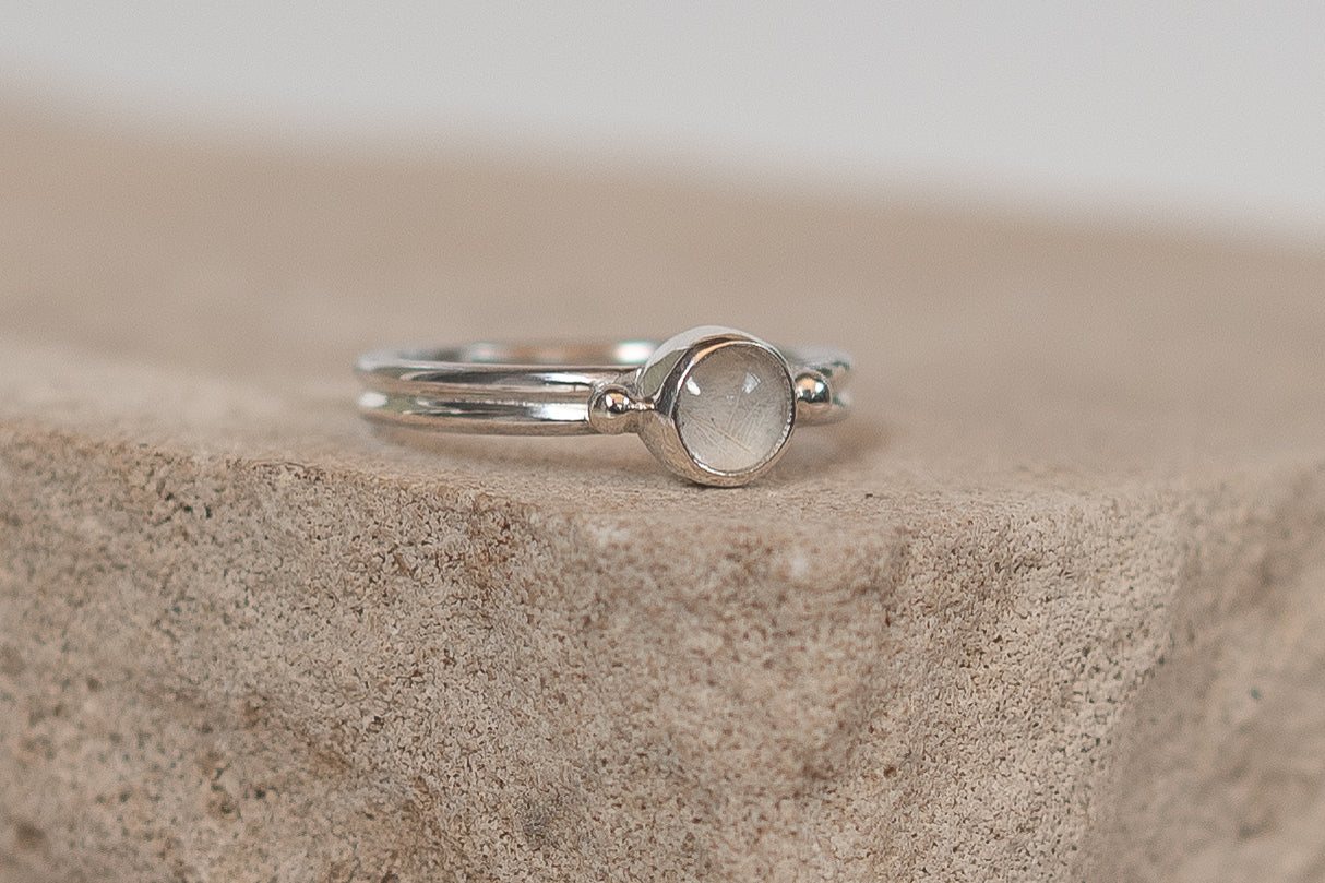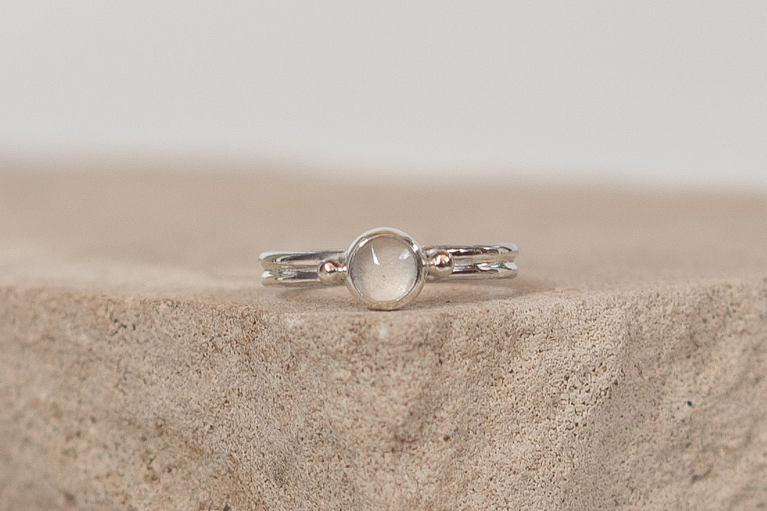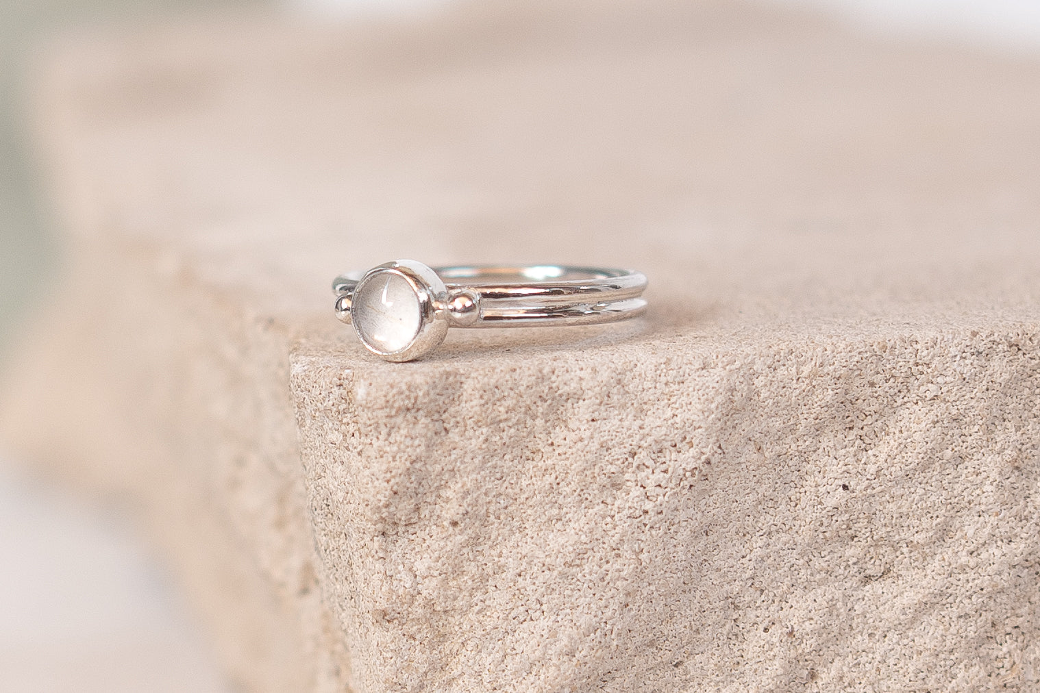 Dieser besondere Ring entsteht aus zwei miteinander verbundenen Ringen und trägt in seiner Mitte ein 6 mm großes Glasfenster, unter dem liebevoll das Haar deines Tieres bewahrt wird. Rechts und links neben dem Glas schmücken zwei kleine Silberperlen den Ring und verleihen ihm eine zarte, elegante Note. Ein handgefertigtes Schmuckstück voller Bedeutung – schlicht, edel und einzigartig wie die Erinnerung, die es trägt.